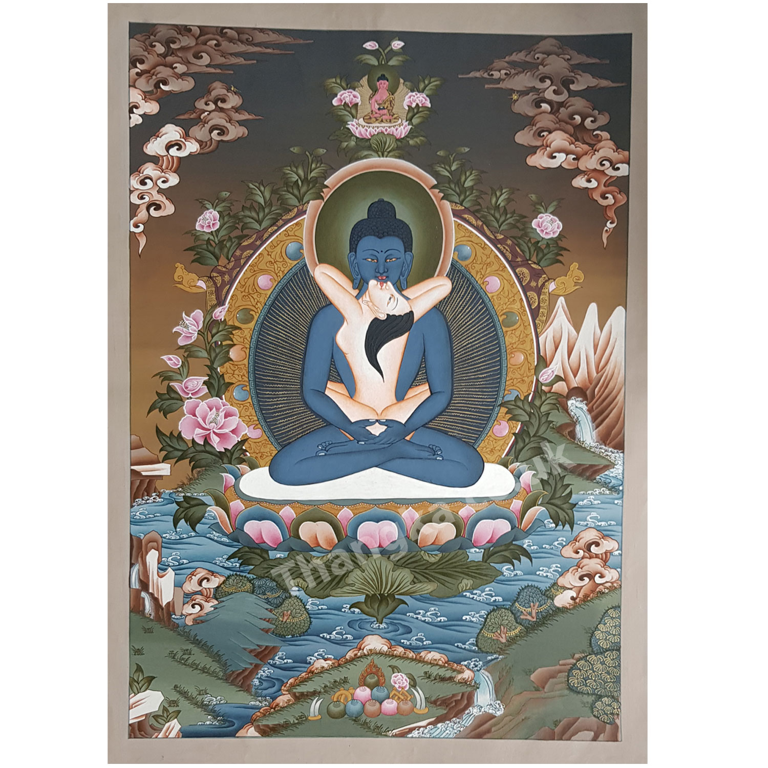 Depicted in the Nyingma tradition, he is the primordial Buddha with inseperable consort. Deep blue in colour, representing the very essence of being – like the blue expanse of sky.