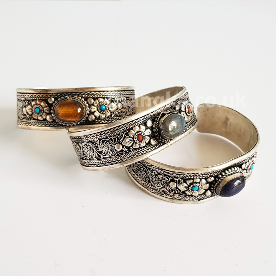 Adjustable metal bangle in traditional tibetan style, with central stone of varying colours flanked by Lotus pattern and smaller stone. Variations available whilst stocks last. Price is for one bracelet.
