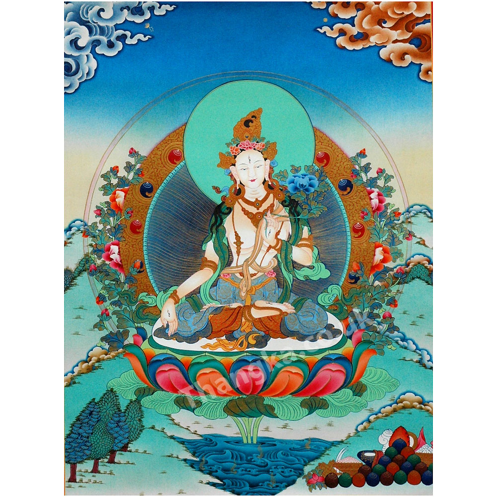 A large thangka of white tara in picturesque rural setting seated on a moon disc supported by a lotus arising from the midst of a pure water lake tara is granting blessings and realisations. White Tara is invoked for long and healthy life for peace prosperity and good fortune.